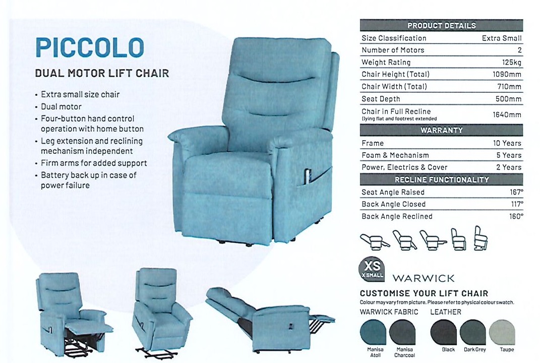 This extra small size chair features dual motor, four-button hand control operation with home button, leg extension and reclining mechanism independent, firm arms for added support, and battery backup in case of power failure. Available in store in Manisa Atoll colour, however can be customised to your liking.